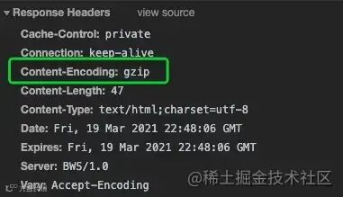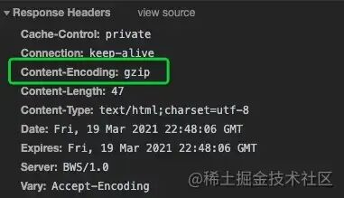 启用 gzip 同时需要客户端和服务端的支持,如果客户端支持 gzip 的解析,那么只要服务端能够返回 gzip 的文件就可以启用 gzip 了,我们可以通过 Nginx 的配置来让服务端支持 gzip 。下面的 respone 中 content-encoding:gzip ,指服务端开启了 gzip 的压缩方式。