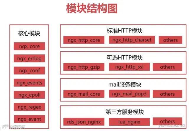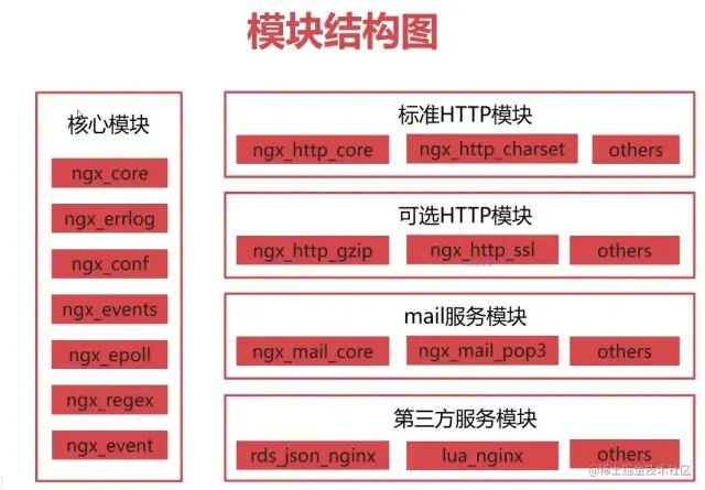 Nginx 的内部结构是由核心部分和一系列的功能模块所组成。这样划分是为了使得每个模块的功能相对简单,便于开发,同时也便于对系统进行功能扩展。Nginx 的模块是互相独立的,低耦合高内聚。