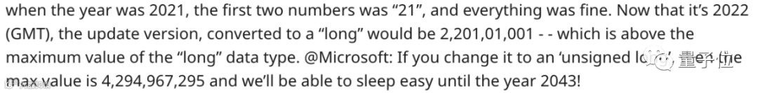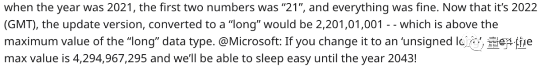 对此有网友调侃,如果微软在修复中把有符号变量改成无符号变量,那么数据的表示范围就会变成0~4294967295,Exchange邮箱又可以用到2043年了