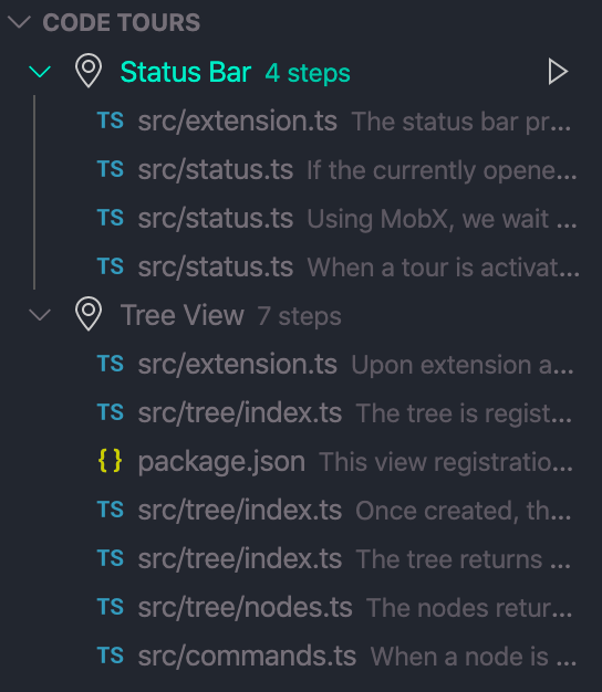 就像一个目录,可以轻松地加入到新的项目/功能,并且可视化错误报告或了解代码审查/PR 更改的上下文。"code tour"只是一系列交互步骤,每个步骤都与特定目录或文件/行进行关联,并包括对相应代码的描述。开发人员可以 clone 一个仓库,然后立即开始学习,而无需参考 CONTRIBUTING.md 文件或依赖他人的帮助。