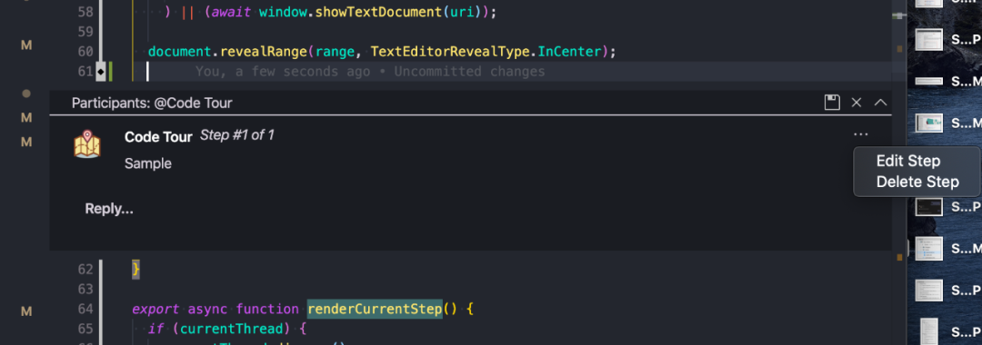 如果需要在录制时编辑或删除步骤,单击 ... 步骤描述旁边的菜单,然后选择适当的操作,也可以从 CodeTour 树视图中查找编辑/删除步骤。