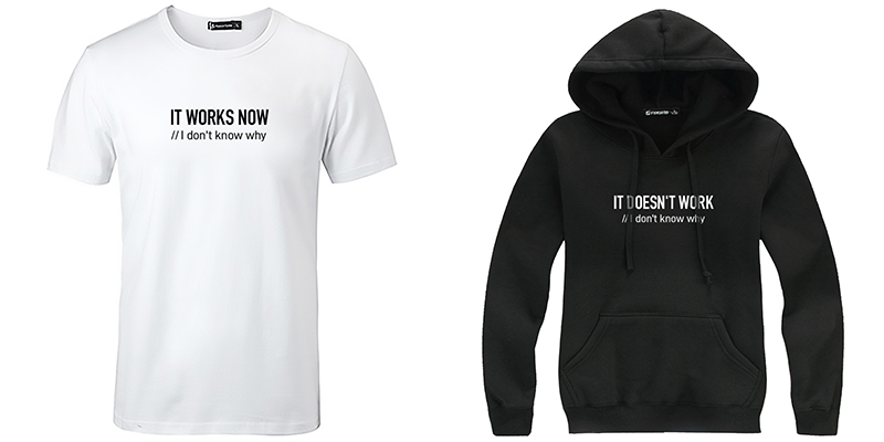 跟老公都是程序员,然后给老公买了两件,跟同事又拼了两件,同事和老公都觉得质量不错,是纯棉的,洗过了之后也不错没有掉色等等问题,图案印花也很好,清晰,快递很给力,总之就是物有所值好,大家可以放心购买咯!