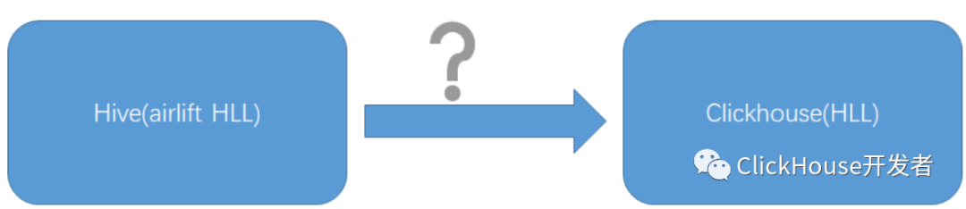 数据产品对接的数仓表中存在大量使用HLL进行非精确统计,以及利用细粒度的HLL数据进行group by 得到粗粒度的数据的使用场景(如流量明细数据(PV),统计商品的浏览UV(HLL)表A,基于表A的商品的浏览UV(HLL)汇总到品牌的UV (merge(uv) group by brand)。此时需要使用binary 数据再次进行merge。因为在spark,presto 底层的airlift 都是使用同一套算法体系,数据产品通过presto 方案hll 数据进行计算没有格式问题。但是我们需要将hive 的hll binary 数据直接导入到clickhouse, 利用clickhouse的查询engine来解决数据产品的SLA 问题,那么我们需要将数据产品的使用场景在clickhouse 得到解决,因此我们需要解决的问题是hive airlift的HLL 数据怎么导入clickhouse 以及导入后在clickhouse 中怎么使用hive airlift hll 数据(如图9)。