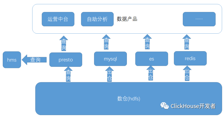 | 数据出仓到mysql | 对于时延敏感<1s, 查询量大且总体数据量较小的情况 | 可以支持较高的qps (1w), 时延低 | 每个业务方都是自己申请mysql, 自己出仓,不方便数据整体管理 | 否 |