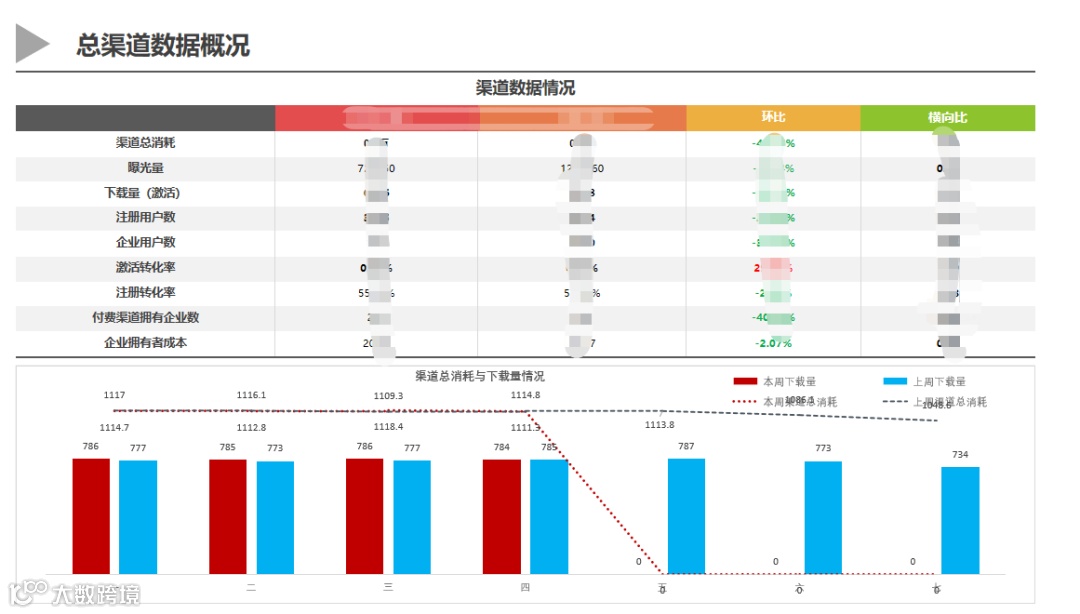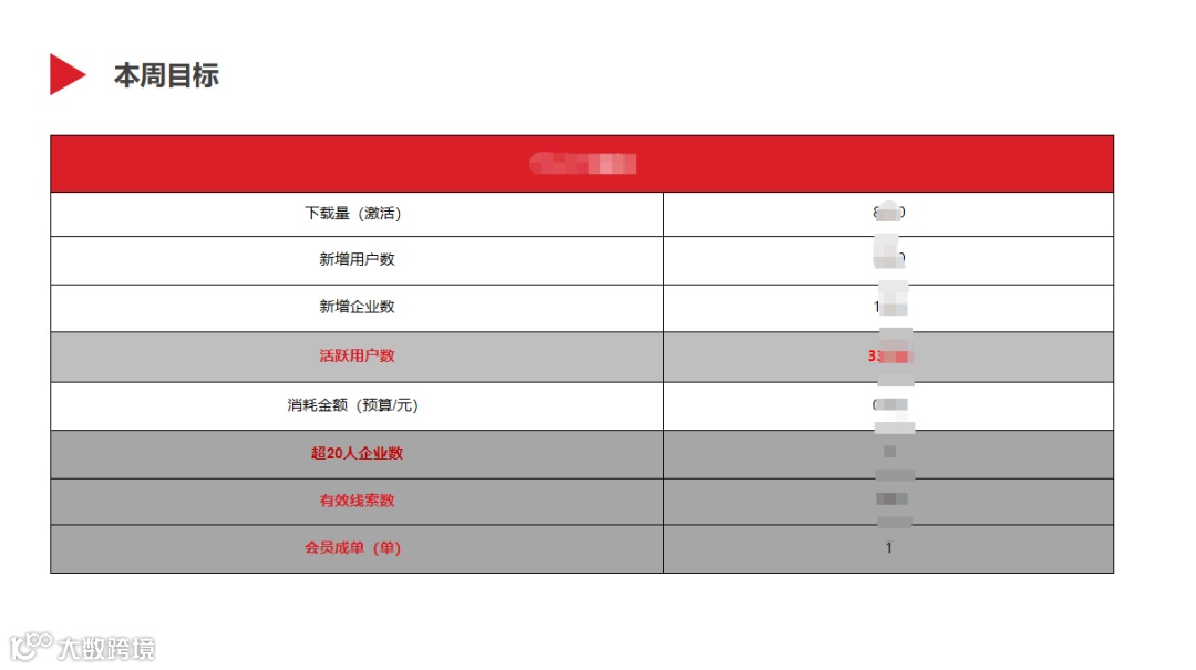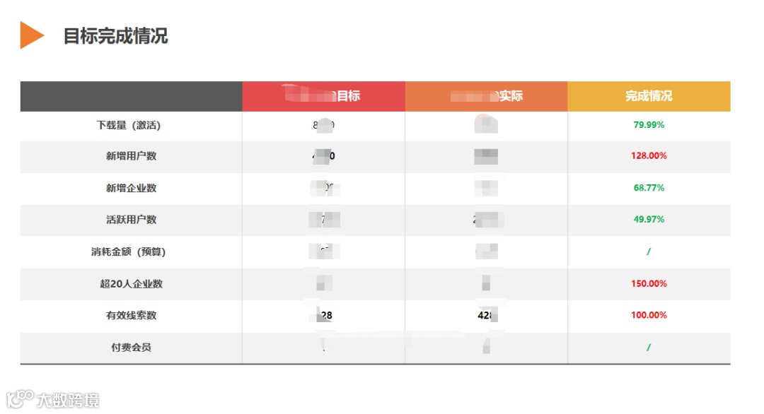 注:如上表所示,核心指标已飘红,未达预期部分的目标完成度以绿色表示下降,加上颜色,从而让报告的阅读者一目了然知道核心指标完成情况,以及哪些数据超出预期、哪些数据出现问题,从而引导大家聚焦在问题的分析上。