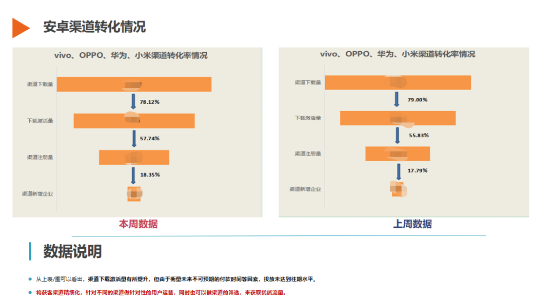 注:这里以渠道新增分析示例,适合于对比多个同类数据的情况,主要是看各个环节的转化率。