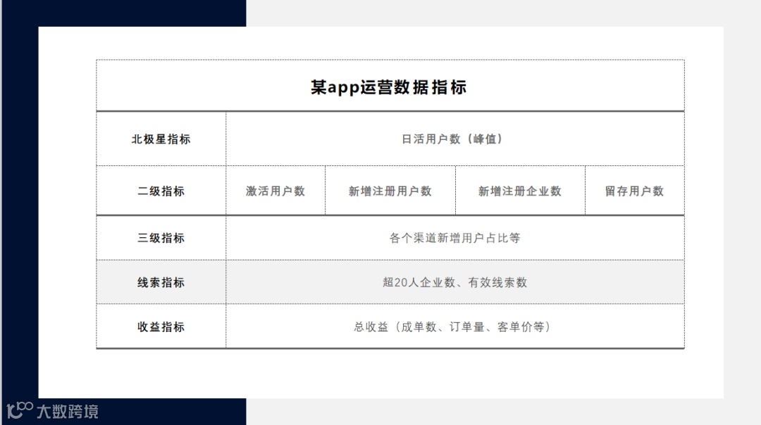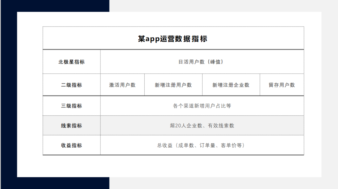 注:此app当时的产品阶段是侧重用户增长,其次才是线索指标,其他指标根据实际情况可以随时调整,以便说明问题。