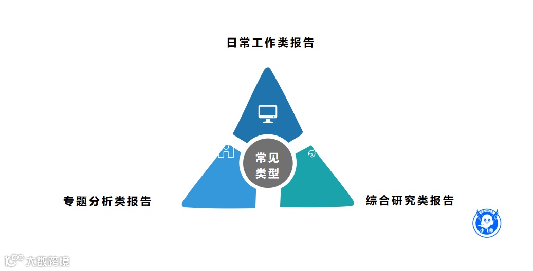 以数据分析的工作场景不同,以及面对汇报对象、内容、方法等情况的不同,我们来梳理一些常见的数据报告类型,主要有:日常工作类、专题分析类、综合研究分析类等常见的数据分析报告。在实际应用中,不同类型对应的数据分析报告以及对于数据分析技能的要求也各有差异。