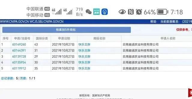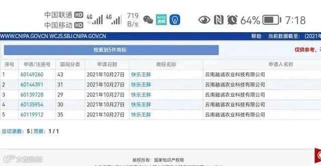 最近几年不断有自媒体头部作者吐槽说商标被人注册了,前有敬汉卿、李子柒等,最近王胖说他的商标也被注册了,“快乐王胖”被人抢先注册,经过在商标官网查询,注册他商标的是云南的一家农业公司。