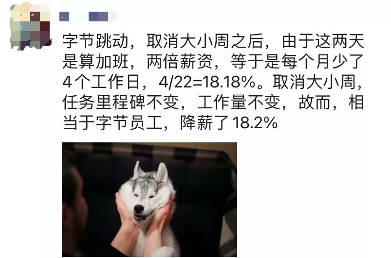 取消大小周,任务里程碑不变,工作量不变,故而,相当于字节员工,降薪了 18.2%。