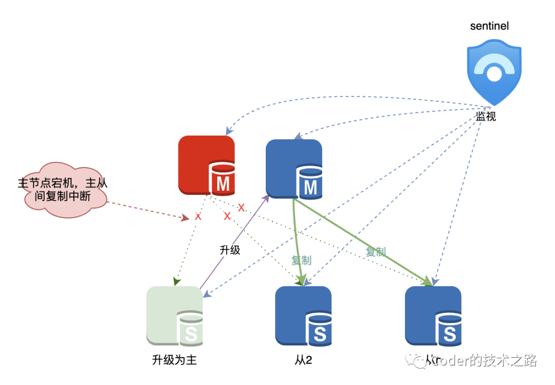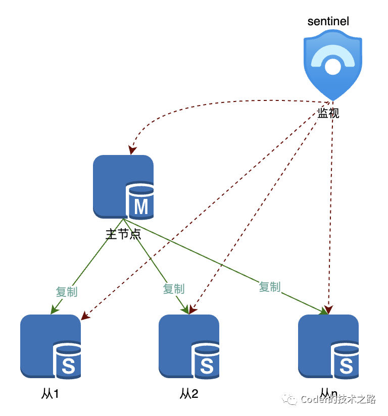 同时,sentinel还会监视宕机的master节点,恢复之后会将其设置为从节点加入集群。