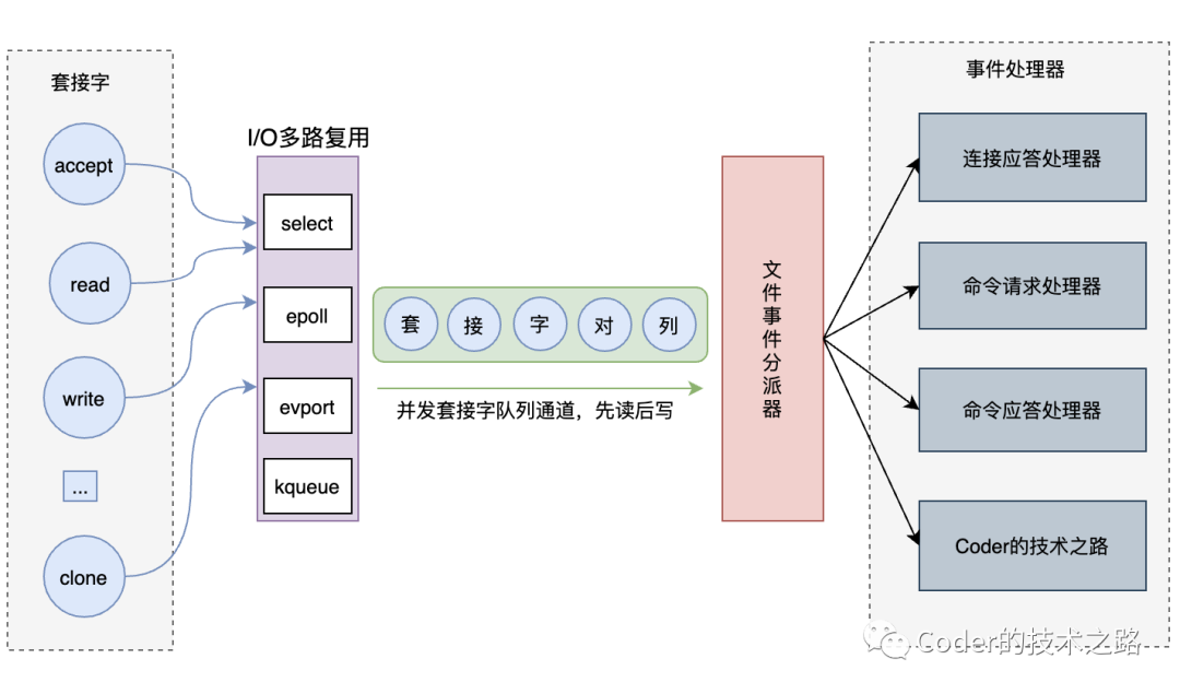 如图所示,Redis的事件驱动架构由套接字、I/O多路复用、文件事件分派器、事件处理器四个部分组成: