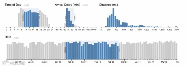Crossfilter应用:当你调整一个图表中的输入范围时,其他关联图表的数据也会随之改变。