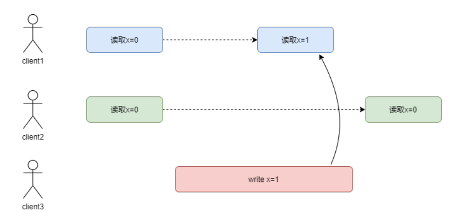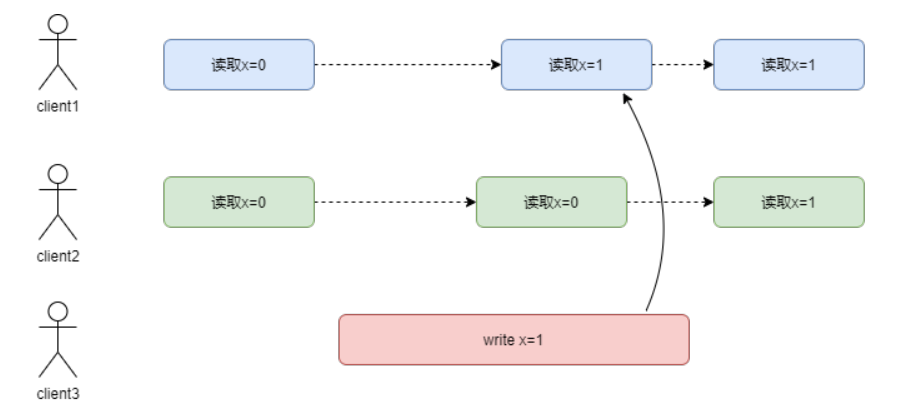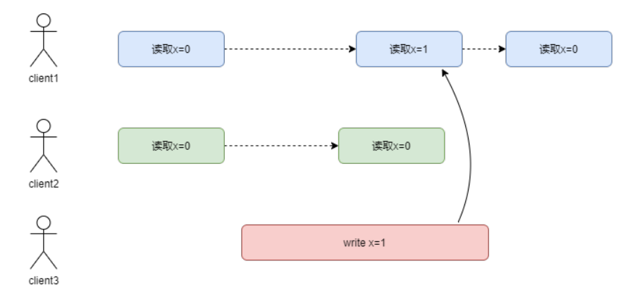 client1第一次读取了x的值是0,第二次读取时因为client3修改了x的值,所以读到了新的值1,但是在client1第二次读取之后,client2来读取x的值,因为读到了别的副本,因为这个副本还没有同步完成,所以读到了旧的值0。