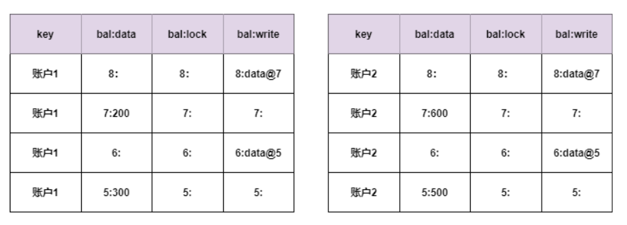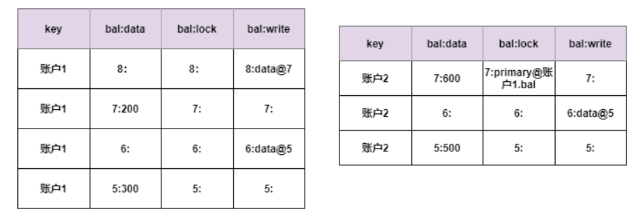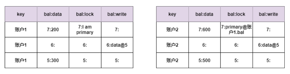 从第二列的数据可以看到,账户1上减少了200元,账户2上增加600元。从第三列可以看到账户1获得了primary lock,账户2上是指向primary lock的锁指针。