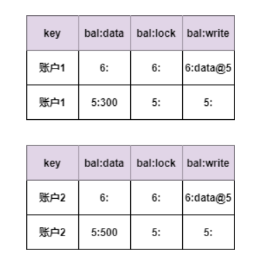 commit阶段,协调节点只需要跟拥有primary lock的分片进行通信,这里只需要跟账户1进行通信,从而保证了commit指令的原子性。这时数据如下表:
