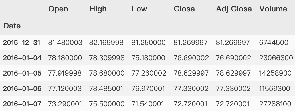 本文将继续使用金融股市数据,market = 'TCEHY'及symbol = 'BABA'股市数据,相关获取方式可参考金融股市数据准备。数据样例如下所示。