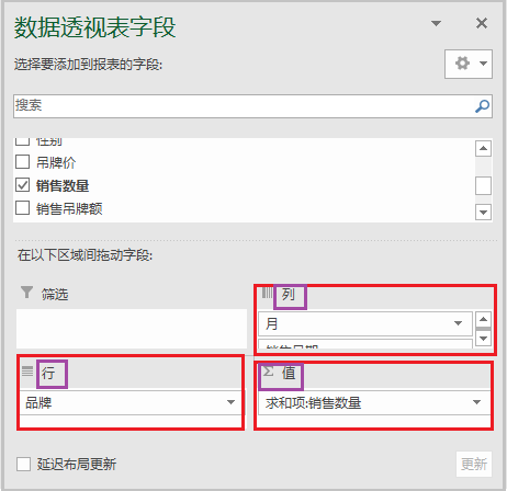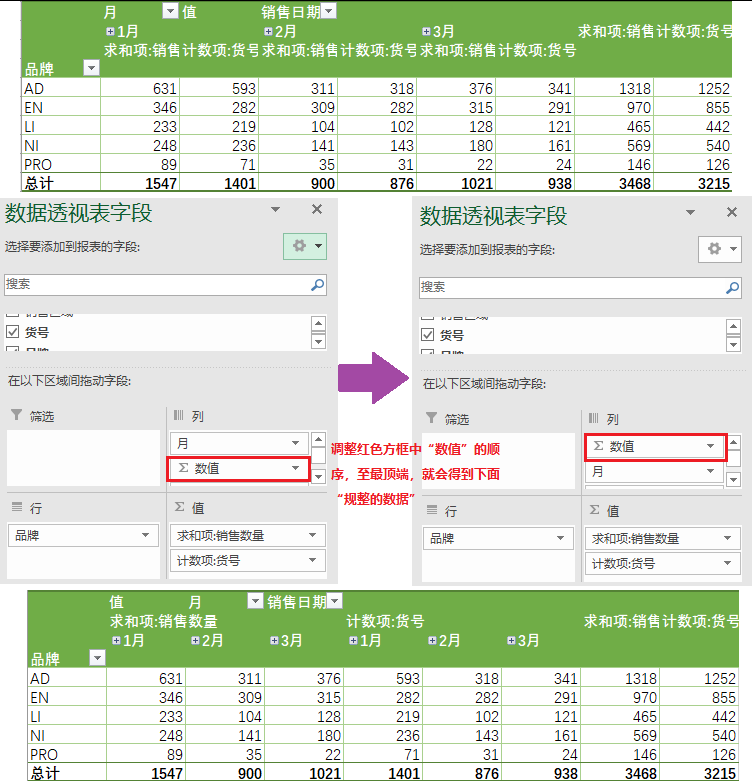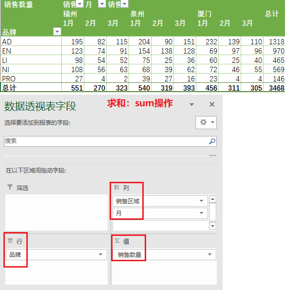 2)求出不同品牌下,每个地区、每个月份的销售数量之和