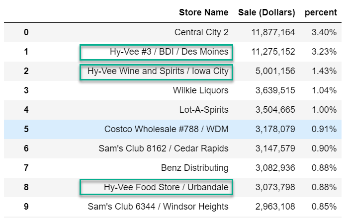 上述代码使用不区分大小写的方式来搜索字符串“Hy Vee”,并将值“Hy Vee”存储在名为Store_Group_1的新列中。这个代码可以有效地将“Hy Vee#3/BDI/Des Moines”或“Hy Vee Food Store/Urbandale”等名称转换为正常的“Hy Vee”。