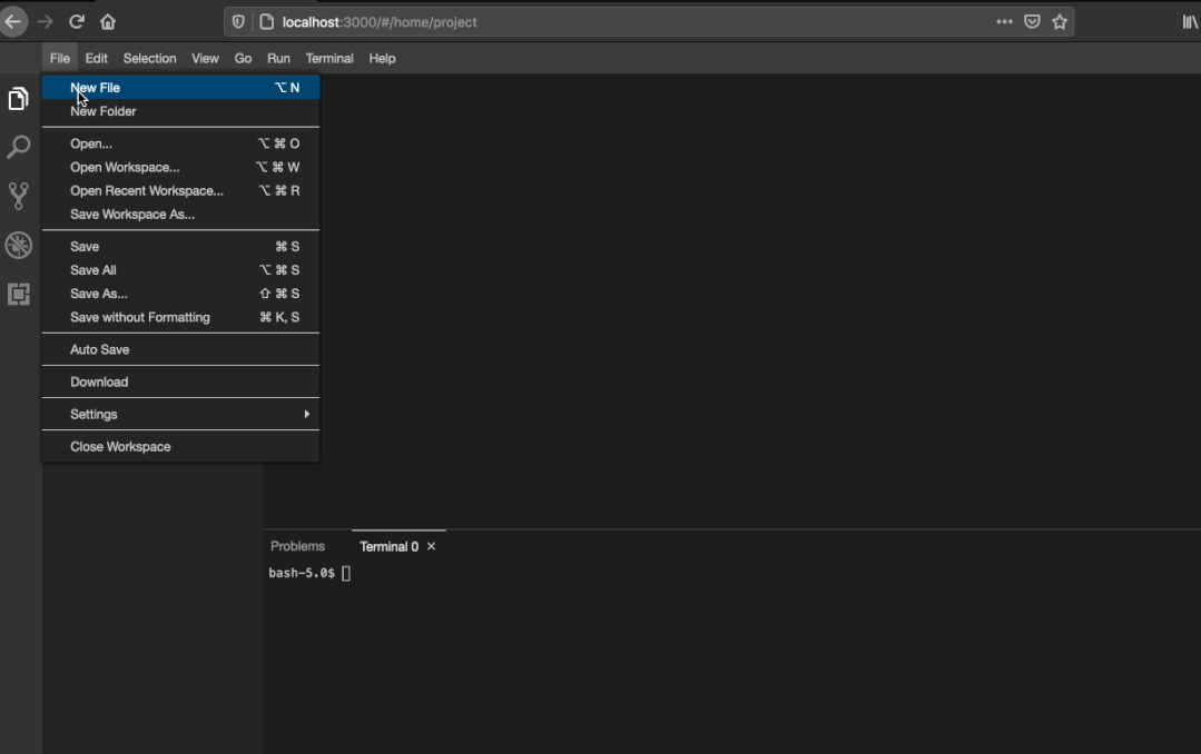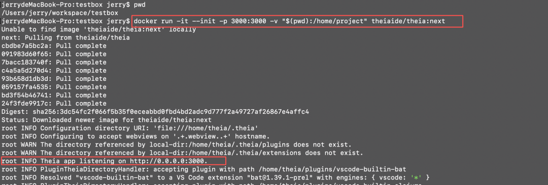 docker run -it --init -p 3000:3000 -v "$(pwd):/home/project" theiaide/theia:next