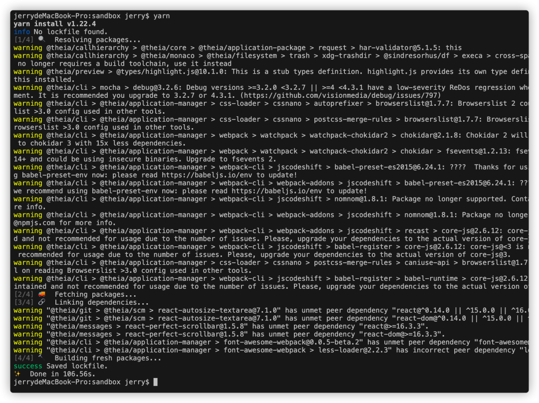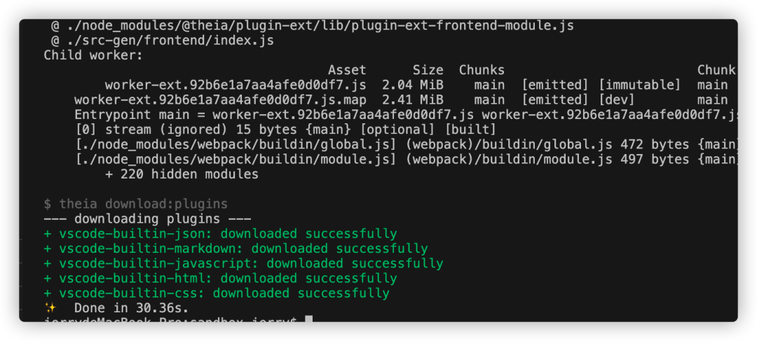 我们更新了 scripts,同时又添加了 theiaPluginsDir 和 theiaPlugins 这两个属性。theiaPluginsDir 是用来设置我们的插件存放地址的,theiaPlugins 就是我们要安装的插件了。运行项目之前,我们要先运行 yarn prepare 来准备环境,我们会在日志中看到插件的下载情况: