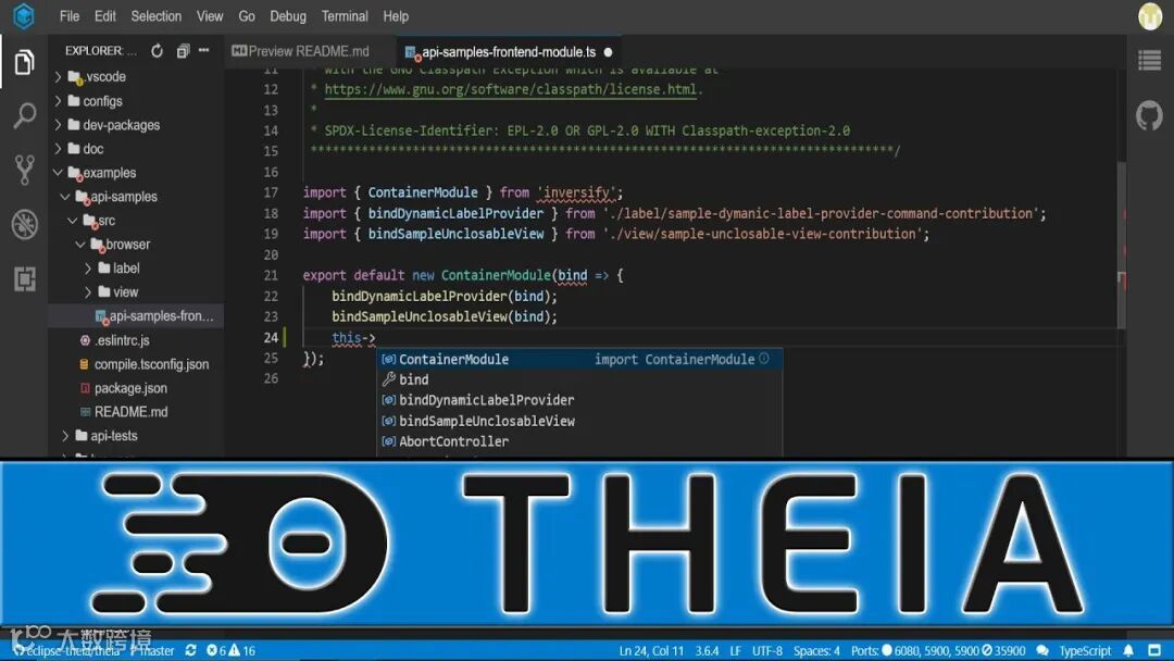 Theia 是一个基于 TS 开发的开源 IDE 框架,基于它我们可以开发出自己定制化的开发工具,它可以部署到云端使用,也可以打包成桌面应用。