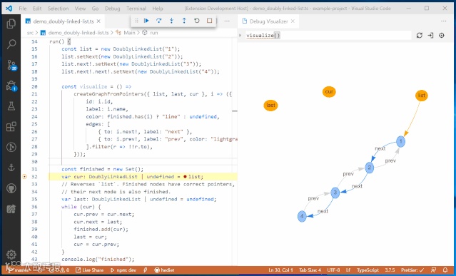 从效果层面上看此款工具更加惊艳,而且跟以往传统 debug 方式的展示形式完全不同,比如将断点设置为第 32 行定义双向链表,随后一行行运行代码就会在右图展现出对应的数据结构图。
