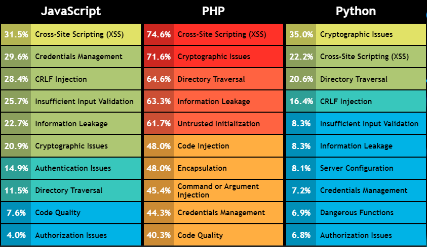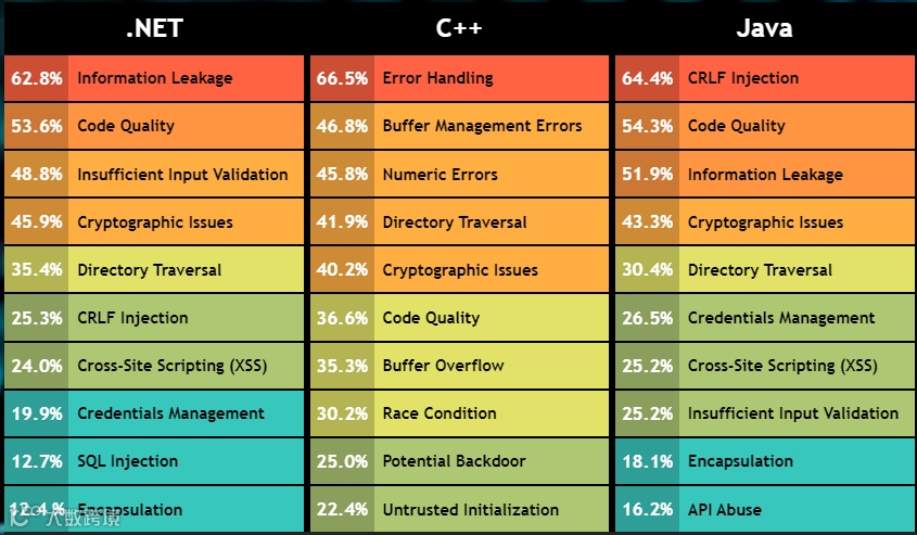 静态代码分析安全公司 Veracode 近日发布了一份应用程序分析报告,结果发现比起 JavaScript 和 Python 等语言,C++ 和 PHP 的安全漏洞要严重得多。