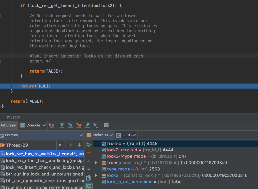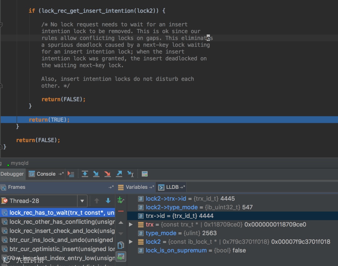 这里sesion1事务4444执行insert时type_mode为2563(LOCK_X | LOCK_GAP | LOCK_INSERT_INTENTION),由于带有LOCK_INSERT_INTENTION标识位,因此需要等待session2事务释放4445的gap锁。后续session1事务4444获得了一个插入意向锁,并且在等待session2事务4445释放gap锁。