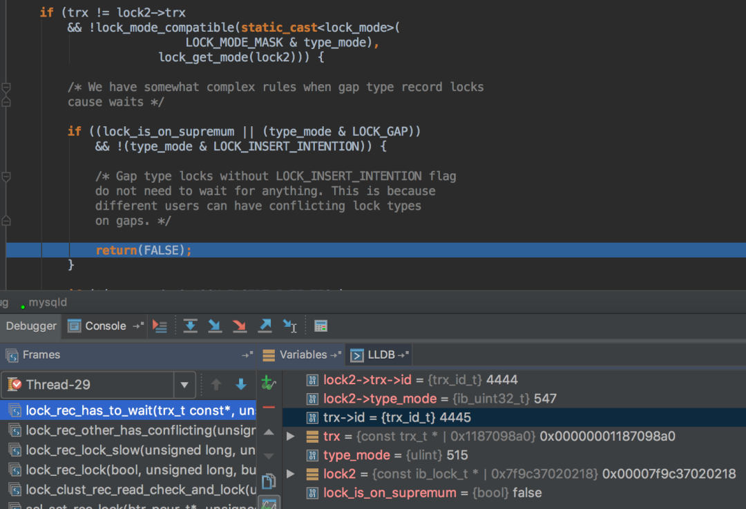 这里session2的事务4445加锁的type_mode为515,也即(LOCK_X | LOCK_GAP),与session1事务的锁4444的gap锁lock2->type_mode=547(LOCK_X | LOCK_REC | LOCK_GAP)的lock_mode是不兼容的(两者皆为LOCK_X)。然而由于type_mode满足LOCK_GAP且不带有LCK_INSERT_INTENTION的标识位,这里会判定为不需要等待。因此,第二个session执行select for update也同样成功加上gap锁了。