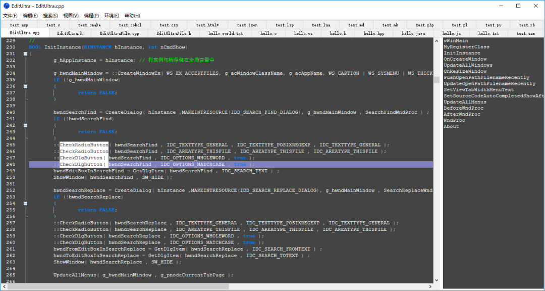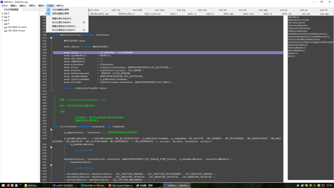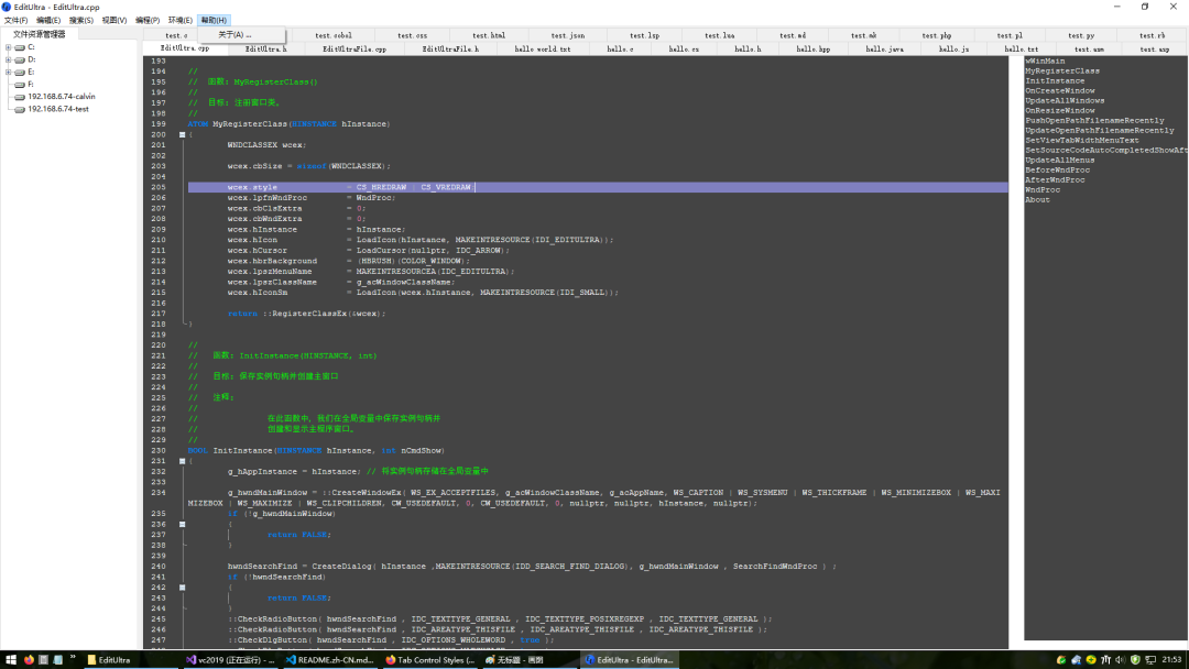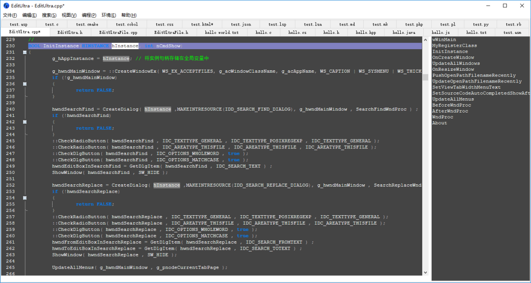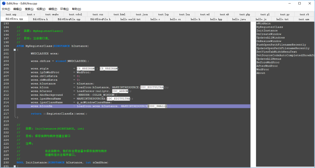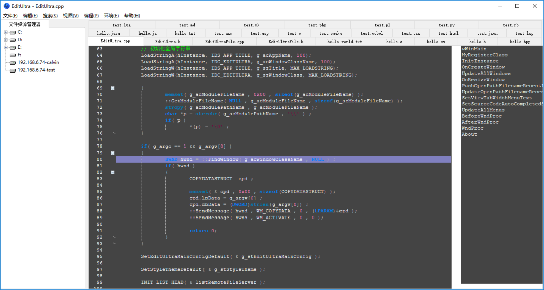 EditUltra预置了众多语言的符号提取正则表达式(位于配置文件conf/doctype_(语言名).conf中的symbol_reqular_exp配置值),匹配出来的符号显示成编辑区右边的符号列表框中,可鼠标左键双击符号直接跳到符号定义处。用户可根据需要,自行修改配置文件以调整匹配式。