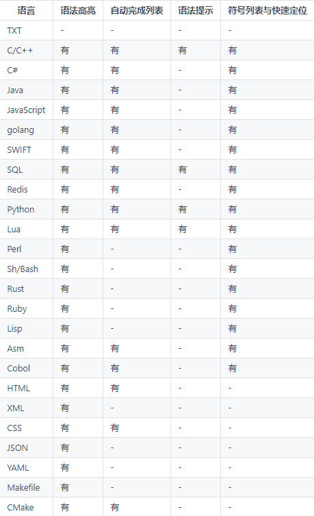 目前已支持25种编程语言和标记语言,每种语言的配置文件为conf/doctype_(语言名).conf,一般keywords.set配置为语法高亮单词列表,keywords2.set配置为库函数等第三方符号列表,autocomplete.set配置为键入时弹出自动完成单词列表,calltip.add为浮动显示语法提示文本,symbol_reqular_exp为正则表达式匹配源代码出符号表放到编辑区右边列表框供鼠标左键双击后直接跳到定义处行。