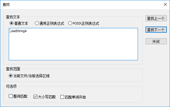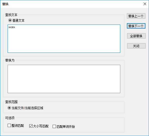 非模态对话框按钮替换上一个、替换下一个、全部替换在不关闭替换对话框时替换所有编辑区匹配字符串处。