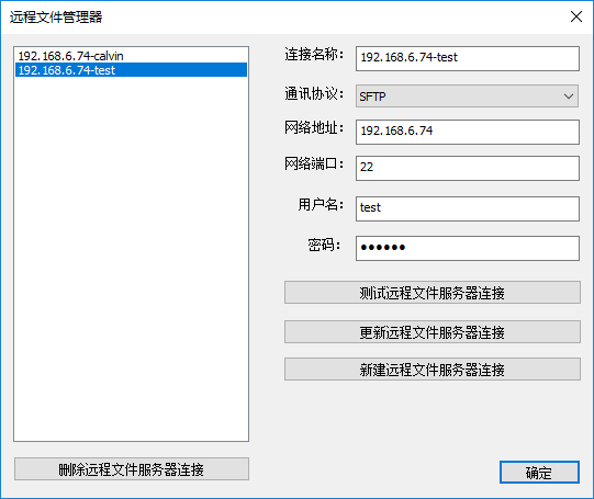 远程文件管理器用于管理远程服务器地址簿。管理器对话框右边是远程服务器信息,填写完后点击测试远程文件服务器连接测试,如果测试通过的话,点击新建远程文件服务器连接加到左边列表中,注意连接名称中不能包含空格等白字符。更新远程文件服务器连接会把右边的信息修改到左边的列表中。左下角的删除远程文件管理器连接会删除左边列表中的当前选择项。