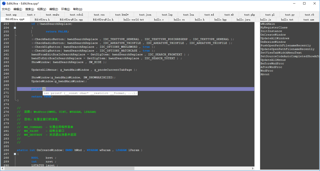 EditUltra完全使用C用纯WIN32API编写而成(v1.0.0.3大约有近2万行代码),又加入了众多优化算法和数据结构,提供了极高的运行效率和较低的系统资源占用,秒开文件,键入时毫秒级弹出自动完成列表。