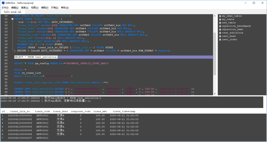 EditUltra约定了.sql为存放数据库SQL的文本文件,额外的,如果发现文件内容以某一特定注释格式(数据库自动连接配置头)出现,则提取相关信息作为连接数据库的参数,在打开文件完成后自动连接数据库,并获取所有能访问的表名列表以及字段信息列表显示到编辑区右边的符号树框中,用户等待连接完成后可直接选择文件后面的SQL并执行,如果执行的是SELECT语句还会把查询结果显示在编辑区下面的表格中。