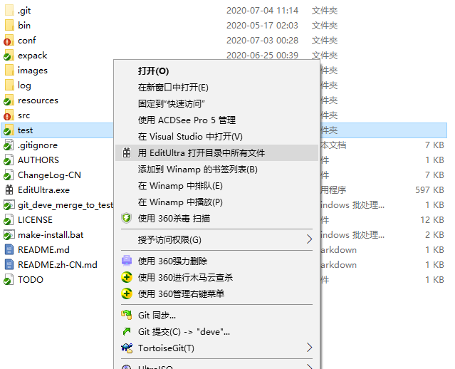 二级菜单目录右键弹出菜单用于向WINDOWS资源管理器右键菜单注册/卸载用 EditUltra 打开目录中所有文件菜单项。