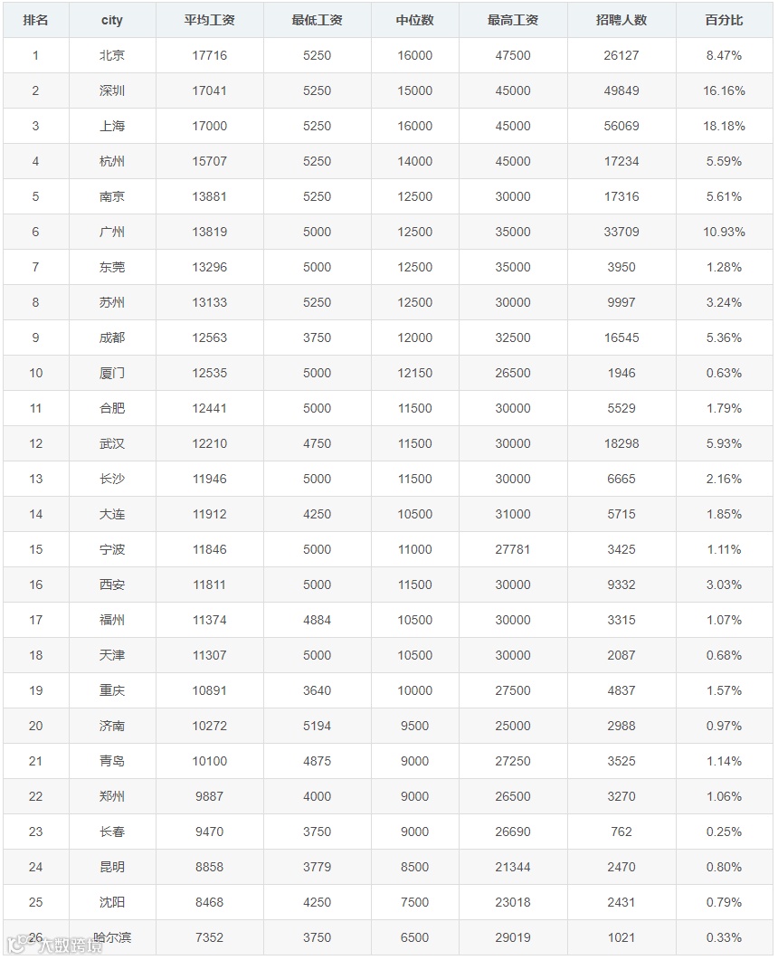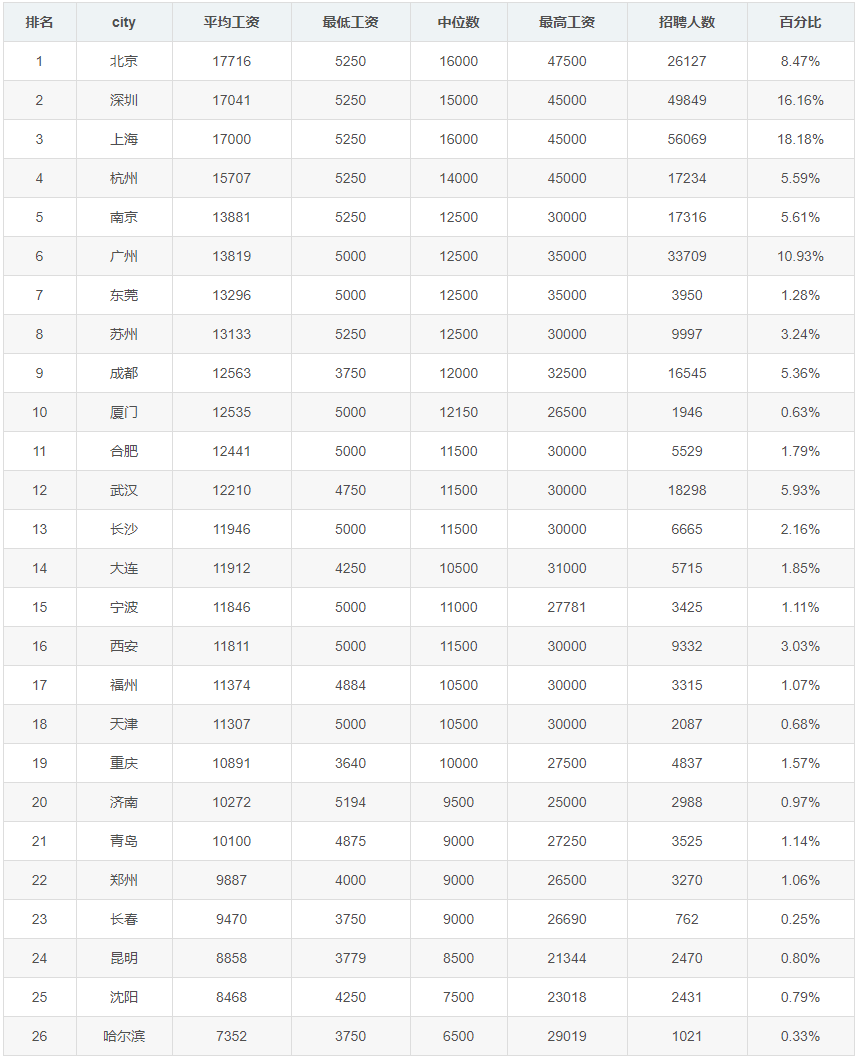 北京,上海,杭州,深圳,仍然是工资最高的四座城市。