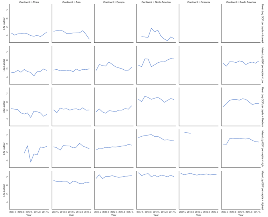 g = sns.FacetGrid(data.groupby([ Mean Log GDP percapita , Year , Continent ])[ Life Ladder ].mean().reset_index(),row= Mean Log GDP per capita ,col= Continent ,margin_titles=True)g = (g.map(plt.plot, Year , Life Ladder ))
