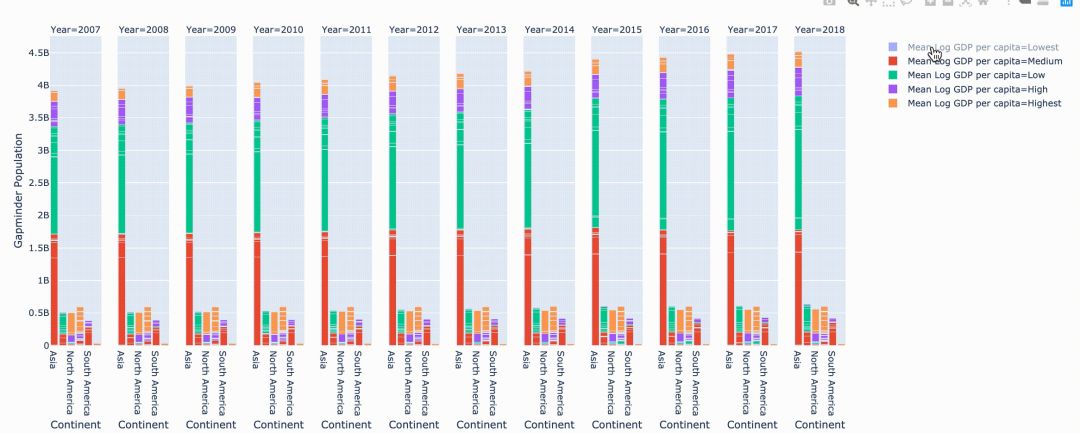 fig = px.bar(data,x="Continent",y="Gapminder Population",color="Mean Log GDP percapita",barmode="stack",facet_col="Year",category_orders={"Year":range(2007,2019)},hover_name= Country name ,hover_data=["Mean Log GDP percapita","Gapminder Population","Life Ladder"])fig.show()
