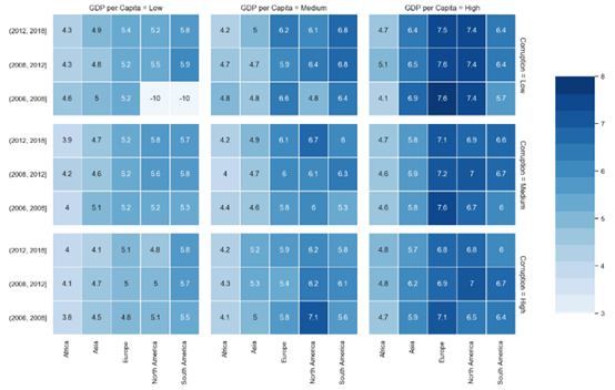 defdraw_heatmap(data,inner_row, inner_col, outer_row, outer_col, values, vmin,vmax):sns.set(font_scale=1)fg = sns.FacetGrid(data,row=outer_row,col=outer_col,margin_titles=True)position = left, bottom, width, height =1.4, .2, .1, .6cbar_ax = fg.fig.add_axes(position)fg.map_dataframe(draw_heatmap_facet,x_col=inner_col,y_col=inner_row,values=values,cbar_ax=cbar_ax,vmin=vmin,vmax=vmax)fg.fig.subplots_adjust(right=1.3)plt.show()defdraw_heatmap_facet(*args, **kwargs):data = kwargs.pop( data )x_col = kwargs.pop( x_col )y_col = kwargs.pop( y_col )values = kwargs.pop( values )d = data.pivot(index=y_col, columns=x_col, values=values)annot =round(d,4).valuescmap = sns.color_palette("Blues",30) + sns.color_palette("Blues",30)[0::2]#cmap = sns.color_palette("Blues",30)sns.heatmap(d,**kwargs,annot=annot,center=0,cmap=cmap,linewidth=.5)# Data preparation_ = data.copy()_[ Year ] = pd.cut(_[ Year ],bins=[2006,2008,2012,2018])_[ GDP per Capita ] = _.groupby([ Continent , Year ])[ Log GDP per capita ].transform(pd.qcut,q=3,labels=([ Low , Medium , High ])).fillna( Low )_[ Corruption ] = _.groupby([ Continent , GDP per Capita ])[ Perceptions of corruption ].transform(pd.qcut,q=3,labels=([ Low , Medium , High ]))_ = _[_[ Continent ] != Oceania ].groupby([ Year , Continent , GDP per Capita , Corruption ])[ Life Ladder ].mean().reset_index()_[ Life Ladder ] = _[ Life Ladder ].fillna(-10)draw_heatmap(data=_,outer_row= Corruption ,outer_col= GDP per Capita ,inner_row= Year ,inner_col= Continent ,values= Life Ladder ,vmin=3,vmax=8,)