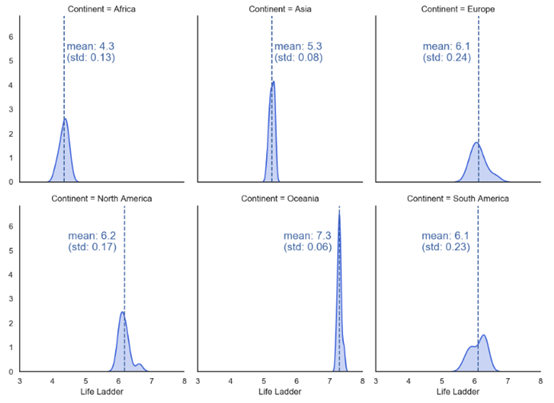 defvertical_mean_line(x, **kwargs):plt.axvline(x.mean(), linestyle="--",color= kwargs.get("color", "r"))txkw =dict(size=15, color= kwargs.get("color", "r"))label_x_pos_adjustment =0.08# this needs customization based on your datalabel_y_pos_adjustment =5# this needs customization based on your dataif x.mean() <6: # this needs customization based on your datatx ="mean: {:.2f}(std: {:.2f})".format(x.mean(),x.std())plt.text(x.mean() + label_x_pos_adjustment, label_y_pos_adjustment, tx, **txkw)else:tx ="mean: {:.2f} (std: {:.2f})".format(x.mean(),x.std())plt.text(x.mean() -1.4, label_y_pos_adjustment, tx, **txkw)_ = data.groupby([ Continent , Year ])[ Life Ladder ].mean().reset_index()g = sns.FacetGrid(_, col="Continent", height=4, aspect=0.9, col_wrap=3, margin_titles=True)g.map(sns.kdeplot, "Life Ladder", shade=True, color= royalblue )g.map(vertical_mean_line, "Life Ladder")