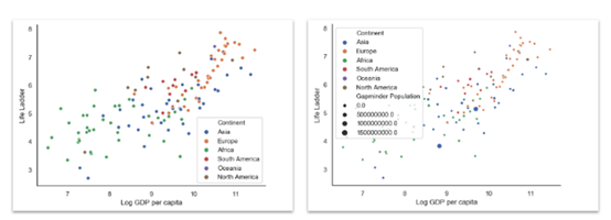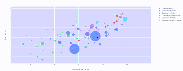 fig = x.<PLOTTYPE>(PARAMS)然后是 fig.show() ,像这样:fig = px.scatter(data_frame=data[data[ Year ] ==2018],x="Log GDP per capita",y="Life Ladder",size="GapminderPopulation",color="Continent",hover_name="Country name",size_max=60)fig.show()