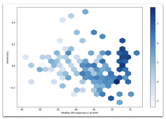 data[data[ Year ] == 2018].plot( kind= hexbin , x= Healthy life expectancy at birth , y= Generosity , C= Life Ladder , gridsize=20, figsize=(12,8), cmap="Blues", # defaults togreenish sharex=False # required to get rid ofa bug)