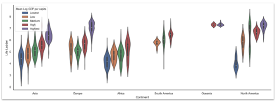 sns.set( rc={ figure.figsize :(18,6)}, style="white")sns.violinplot( x= Continent , y= Life Ladder , hue= Mean Log GDP per capita , data=data)sns.despine()