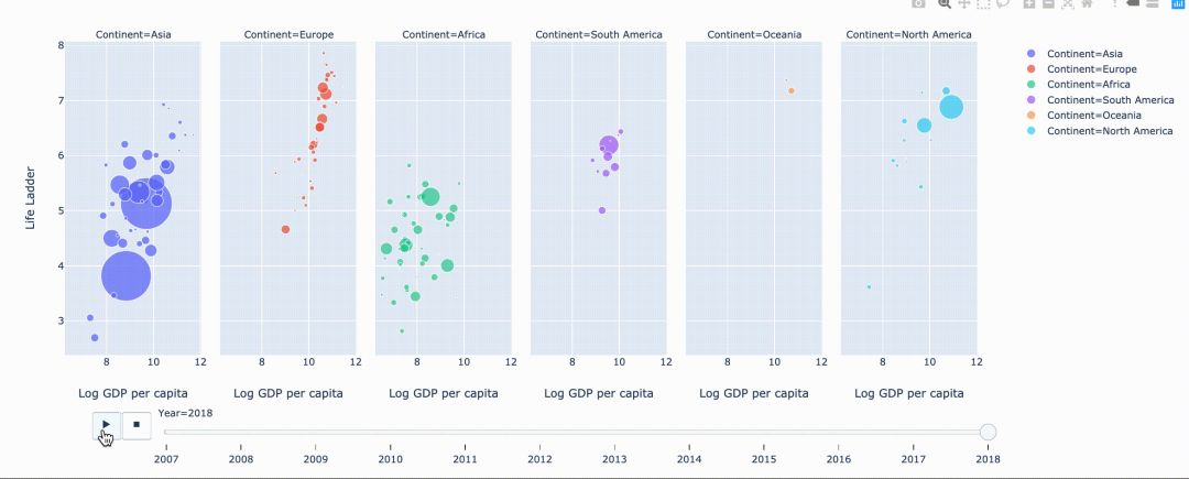 fig = px.scatter(data=data,x="Log GDP per capita",y="Life Ladder",animation_frame="Year",animation_group="Countryname",size="GapminderPopulation",color="Continent",hover_name="Country name",facet_col="Continent",size_max=45,category_orders={ Year :list(range(2007,2019))})fig.show()