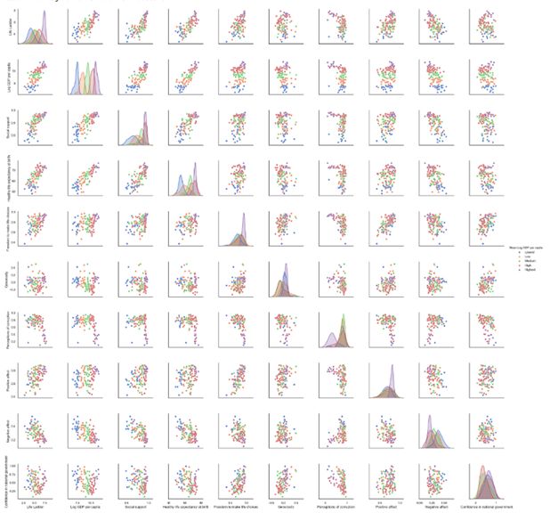 sns.set(style="white",palette="muted",color_codes=True)sns.pairplot(data[data.Year == 2018][[Life Ladder , Log GDP percapita ,Social support , Healthy lifeexpectancy at birth ,Freedom to make lifechoices , Generosity ,Perceptions of corruption , Positive affect ,Negative affect , Confidence innational government ,Mean Log GDP per capita]].dropna(),hue= Mean Log GDP per capita)