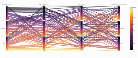 def q_bin_in_3(col):return pd.qcut(col,q=3,labels=[ Low , Medium , High ])_ = data.copy()_[ Social support ] = _.groupby( Year )[ Socialsupport ].transform(q_bin_in_3)_[ Life Expectancy ] =_.groupby( Year )[ Healthy life expectancy atbirth ].transform(q_bin_in_3)_[ Generosity ] =_.groupby( Year )[ Generosity ].transform(q_bin_in_3)_[ Perceptions ofcorruption ] = _.groupby( Year )[ Perceptions ofcorruption ].transform(q_bin_in_3)_ = _.groupby([ Social support , LifeExpectancy , Generosity , Perceptions of corruption ])[ LifeLadder ].mean().reset_index()fig = px.parallel_categories(_, color="LifeLadder", color_continuous_scale=px.colors.sequential.Inferno)fig.show()