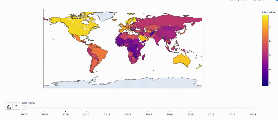 fig = px.choropleth( data, locations="ISO3", color="Life Ladder", hover_name="Country name", animation_frame="Year")fig.show()