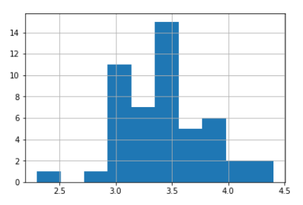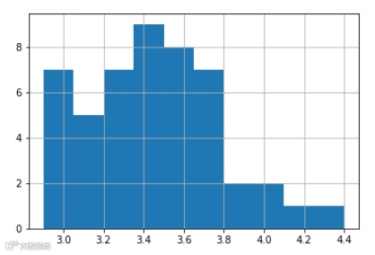 iris_data = iris_data.loc[(iris_data['class'] != 'Iris-setosa') | (iris_data['sepal_width_cm'] >= 2.5)]iris_data.loc[iris_data['class'] == 'Iris-setosa', 'sepal_width_cm'].hist()